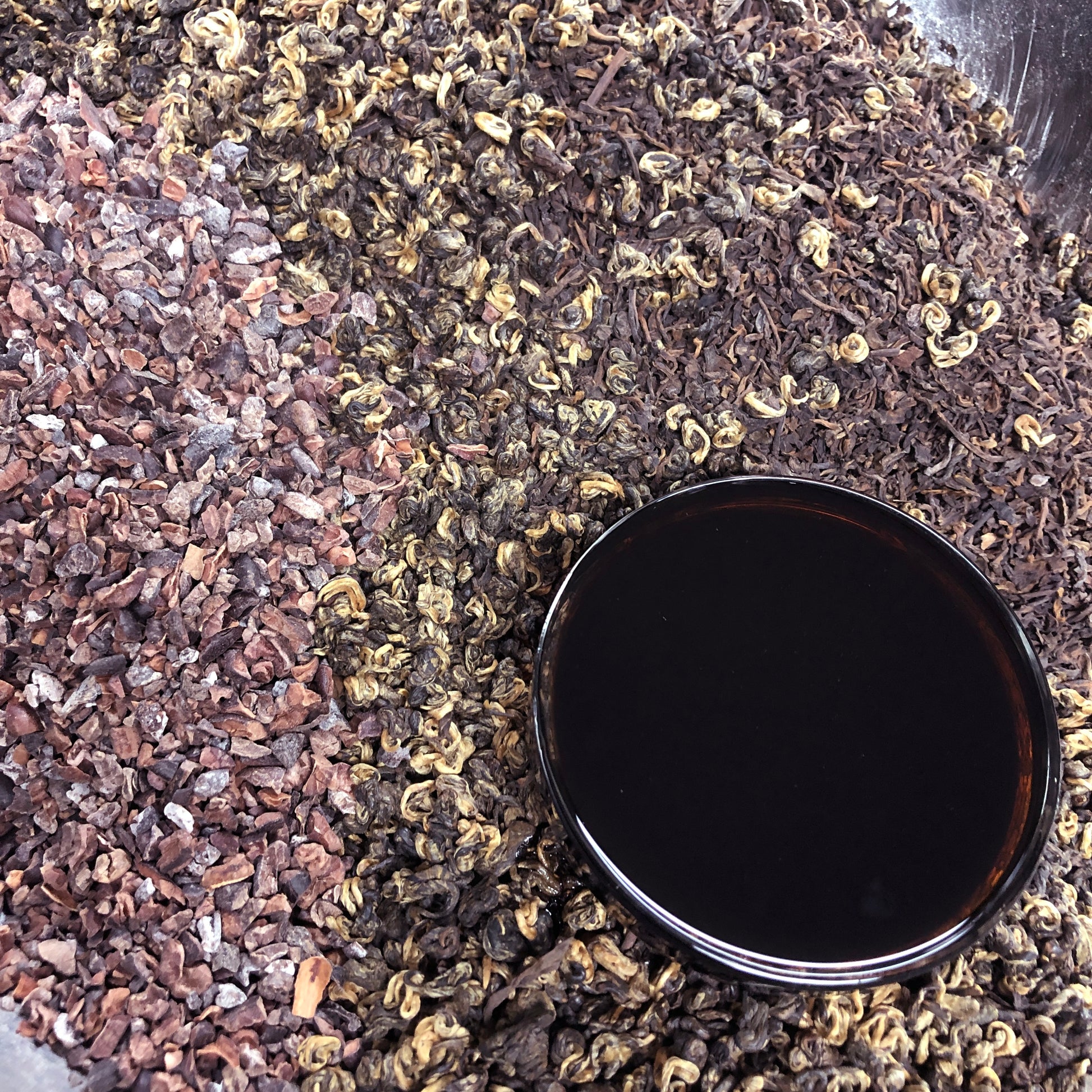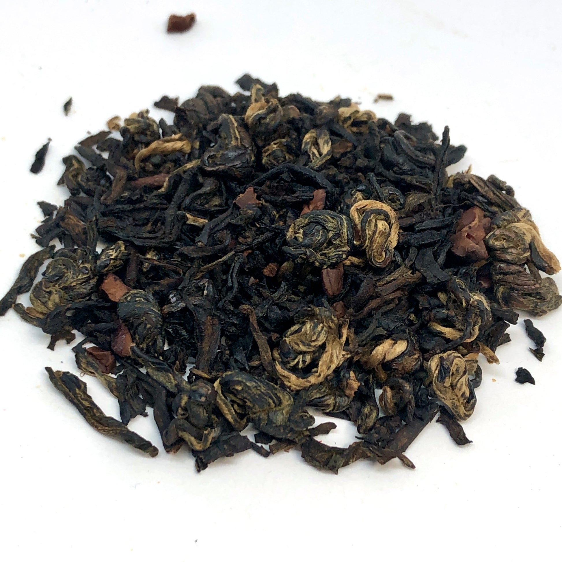 A Yunnan black tea combination of rolled pearls. aged tea, and traditional leaf blended with chopped cocoa nibs and chocolate flavours. Roasted notes from the tea paired with sweet chocolate create guilt free indulgence.