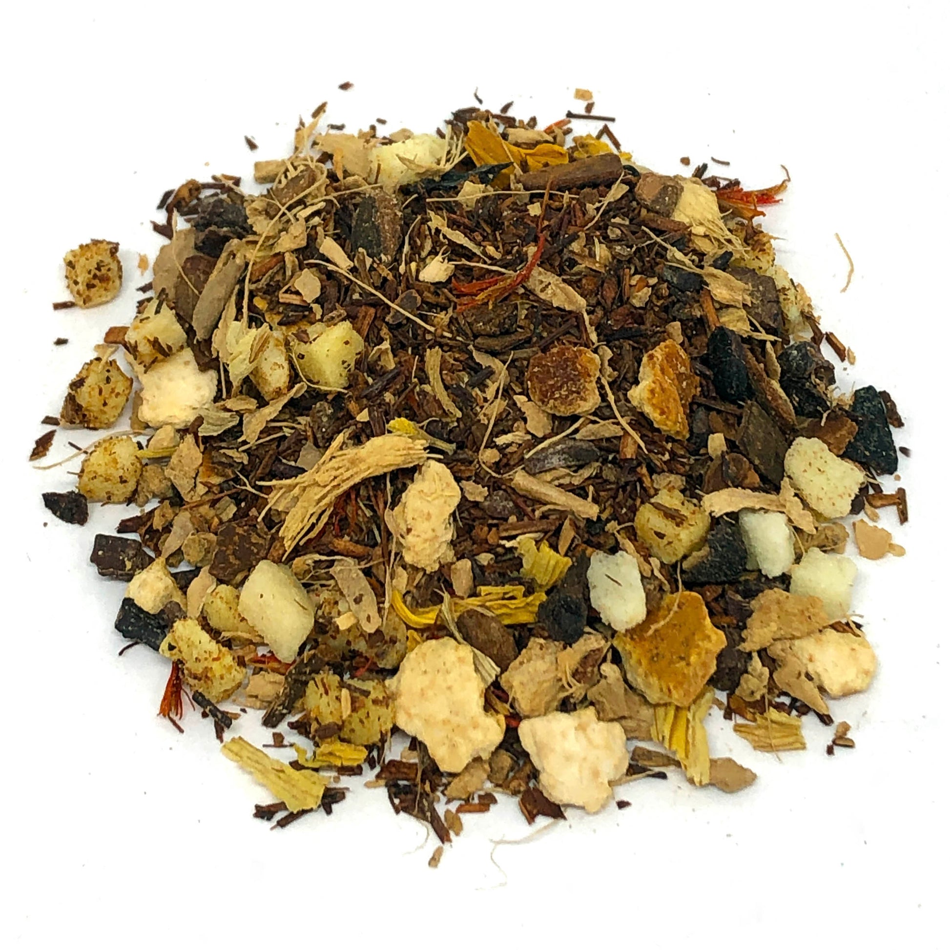 Blenders Notes: This blend has been tricky to get to the right balance of sweetness and spice. The maple sweetness supports the pumpkin aroma and is balanced by a hint of walnut and the heat of ginger spice.The blend is best if allowed to steep at least 5 min so the spices can infuse. The rooibos allows long steeping as it has low tannin and does not go bitter. A splash of sweetener will bring the infusion to perfection.