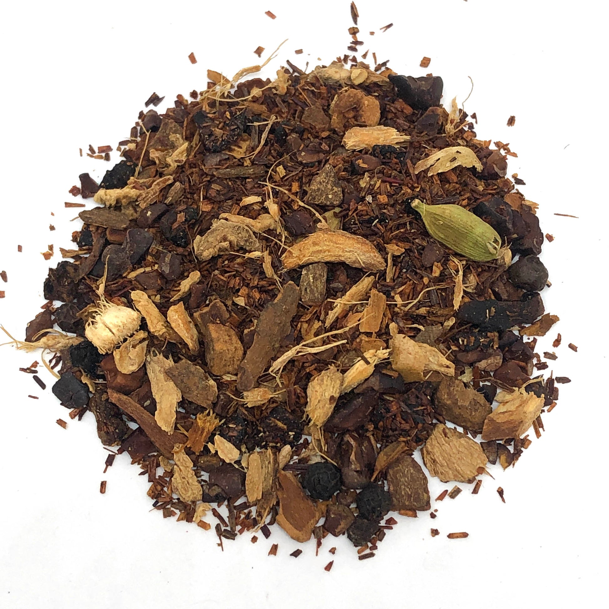 Warm up with this wintery rooibos blend of cocoa bits, roasted chicory, spicy ginger, cardamon and sweet cinnamon all flavoured with chocolate flavours and vanilla.